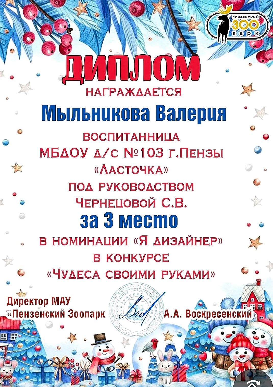 в конкурсе Пензенского Зоопарка "Чудеса своими руками" в номинации "Я дизайнер".