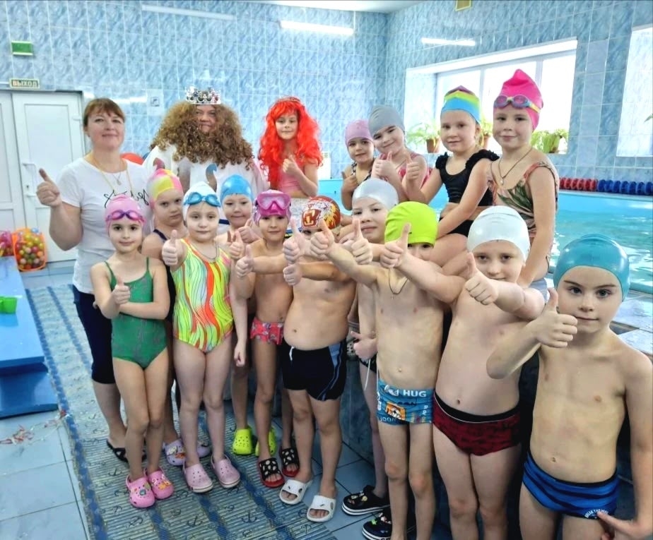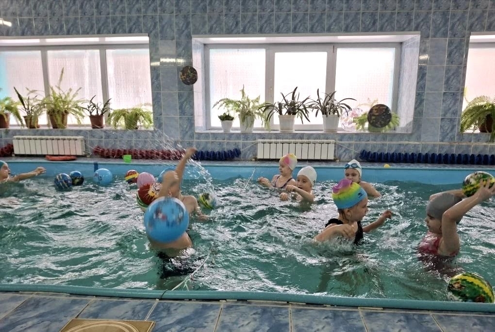 Воспитанники подготовительных к школе групп выполняли задания Нептуна – доставали со дна бассейна сокровища, переправляли игрушки, наполняли ведро волшебной водой и играли в морской волейбол.